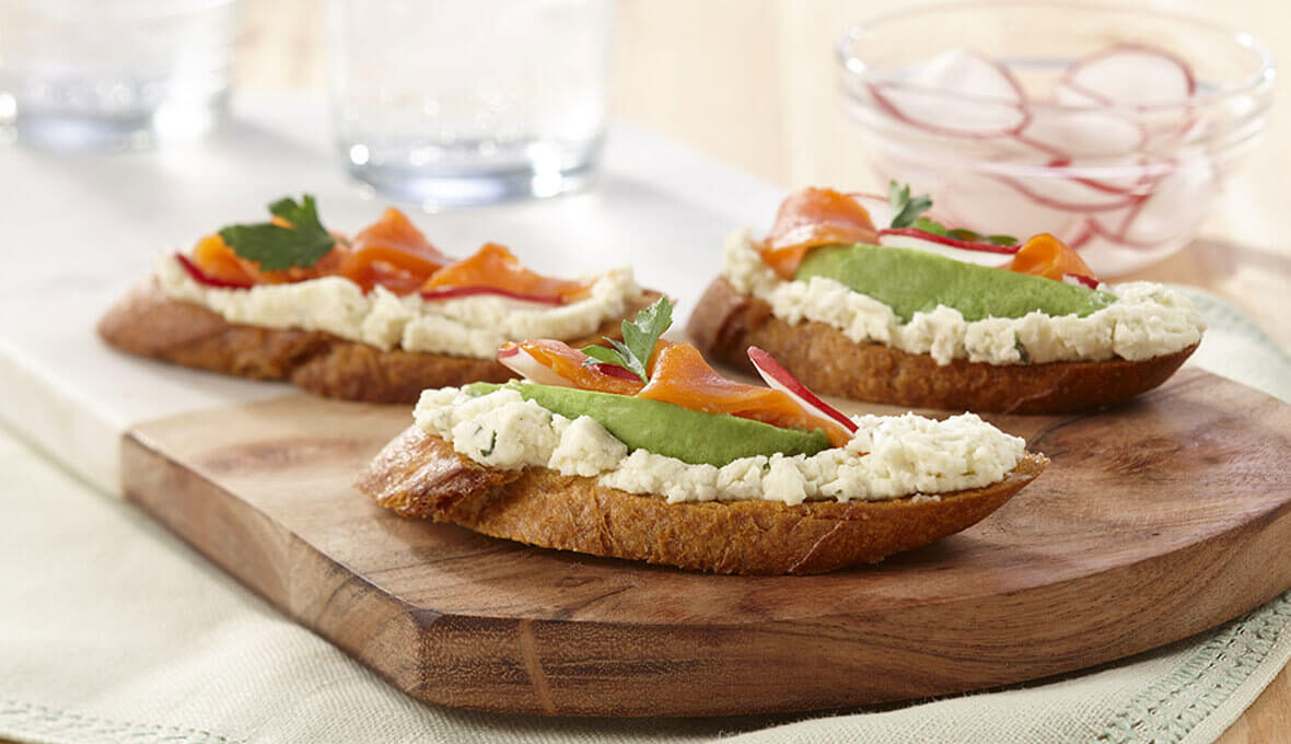 En generös klick Boursin Garlic & Herbs passar perfekt på en crostini, speciellt när den krämiga osten toppas med mogen avokado och rökt lax Gör dig beredd på att laga fler – de kommer att ha strykande åtgång!